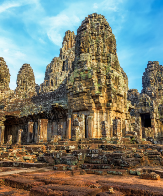 - Đền Angkor Thom – trung tâm là Đền Bayon với 216 nụ cười bí ẩn. Angkor Thom là lãnh địa thủ đô hùng mạnh Khmer xưa. Angkor Thom sở hữu những đền chùa và kiến trúc nổi bật như đền mặt thần Bayon, đền Baphuon, đền Phnom Bakheng ở đỉnh đồi, Elephant Terrace, Terrace of the Leper King và 5 cánh cổng lớn dẫn vào Angkor Thom.