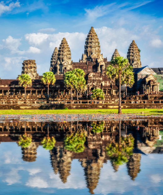 - Đền Angkor Wat – là ngôi đền có kiến trúc hoành tráng nhất trong toàn bộ quần thể di tích đền Angkor, có lối vào chính theo hướng Tây thẳng hướng mặt trời lặn. Đền Angkor Wat có 398 gian phòng, nối liền nhau bởi 1.500m hành lang. Bên trên, 5 toà tháp liên hoàn nhau bằng 3 tầng kiến trúc, trong đó toà tháp cao nhất lên tới 65m, 4 tháp phụ cao 40m. Con đường dẫn tới chính môn của Angkor Wat cũng làm bằng đá tảng dài 230m, rộng gần 10m và có độ cao 5m so với mặt nước hồ ở hai bên đền. Toàn bộ khu đền còn lưu lại dấu vết cổ đại với nhiều hình ảnh nghệ thuật chạm khắc đá như các tấm phù điêu khổng lồ, các cột, cửa, trần, tường, hành lang, lan can, mái…, tất cả toát lên sức mạnh phi thường và bàn tay điêu luyện của người Khmer cổ đại. Quần thể di tích đền Angkor được vua Suryavarman II xây dựng vào nửa đầu thế kỷ XII. Diện tích của cả quần thể kéo dài hơn 248 dặm vuông (400 km2), chạy bao quanh đền là một hào nước sâu và rộng. Với thiết kế ban đầu được xây dựng để thờ Hindu giáo nhưng sau này do sự du nhập và phát triển mạnh của đạo Phật, Angkor Wat đã chuyển sang thờ Phật giáo. Quần thể di tích đền Angkor có đến trên 1.000 ngôi đền với kích cỡ và hình dáng khác nhau mang đậm phong cách kiến trúc Khmer. Các ngôi đền nổi tiếng là Angkor Wat và Angkor Thom, đền Bayon với vô số đồ trang trí điêu khắc và được UNESSCO công nhận di sản năm 1992 với những tác phẩm điêu khắc trên đá tuyệt đẹp.
