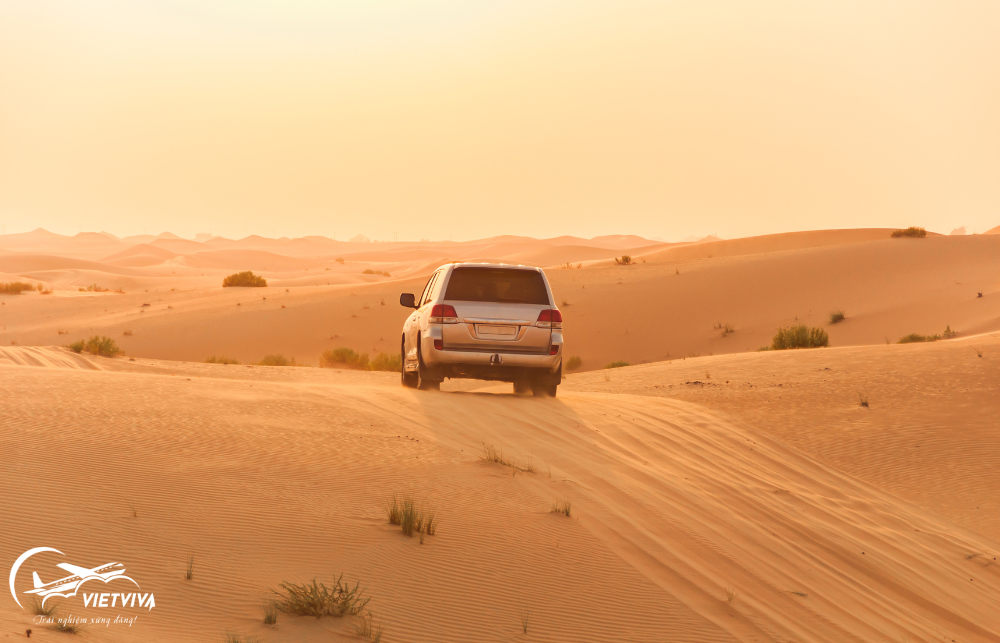 - Desert safari tour: Xe chuyên dụng Land Cruiser đón đoàn tại khách sạn, bắt đầu hành trình khám phá sa mạc, một trong những chương trình không thể thiếu và đặc trưng nhất Dubai.