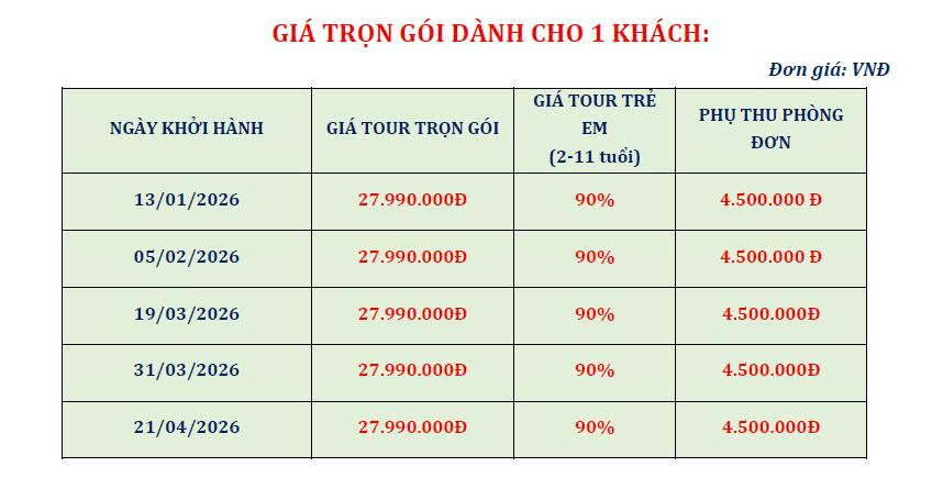 - Tiền Tip cho 01 lái xe và 02 HDV: 8$/khách x6 ngày = 48$