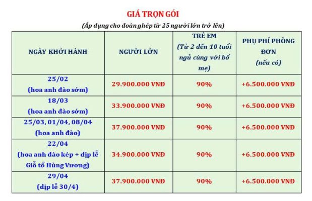 • Chi phí giặt là, điện thoại… và các chi phí khác không bao gồm trong chương trình.