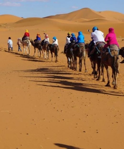 16h30: Đến điểm tập kết, mỗi khách sẽ cưỡi 1 con lạc đà để khám phá sa mạc Sahara. Thời gian du ngoạn sa mạc Sahara trên lưng lạc đà khoảng 60 phút, tiến sâu vào giữa sa mạc và trải nghiệm ngắm hoàng hôn trên những cồn cát của sa mạc.